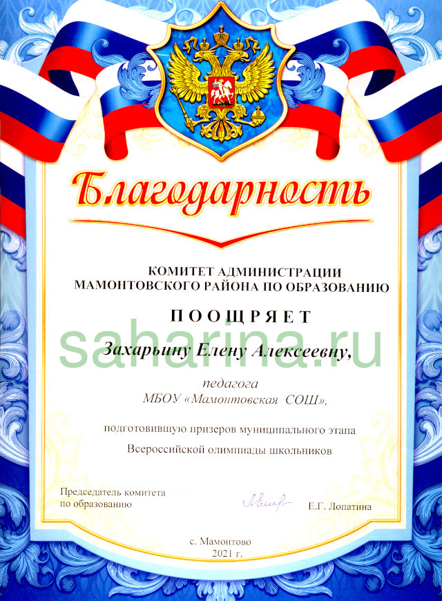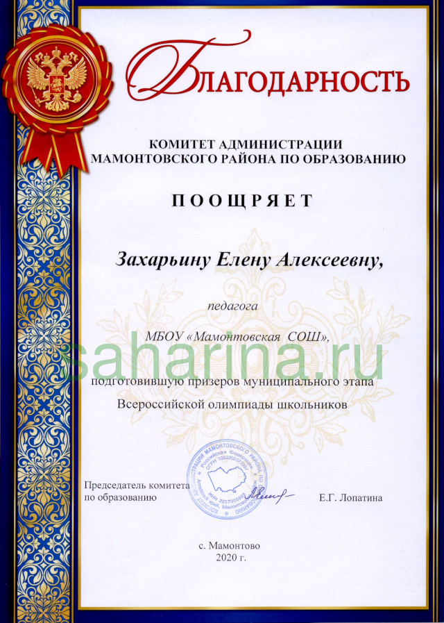 2020 годБлагодарность за подготовку призеров муниципального этапа Всероссийской олимпиады школьников