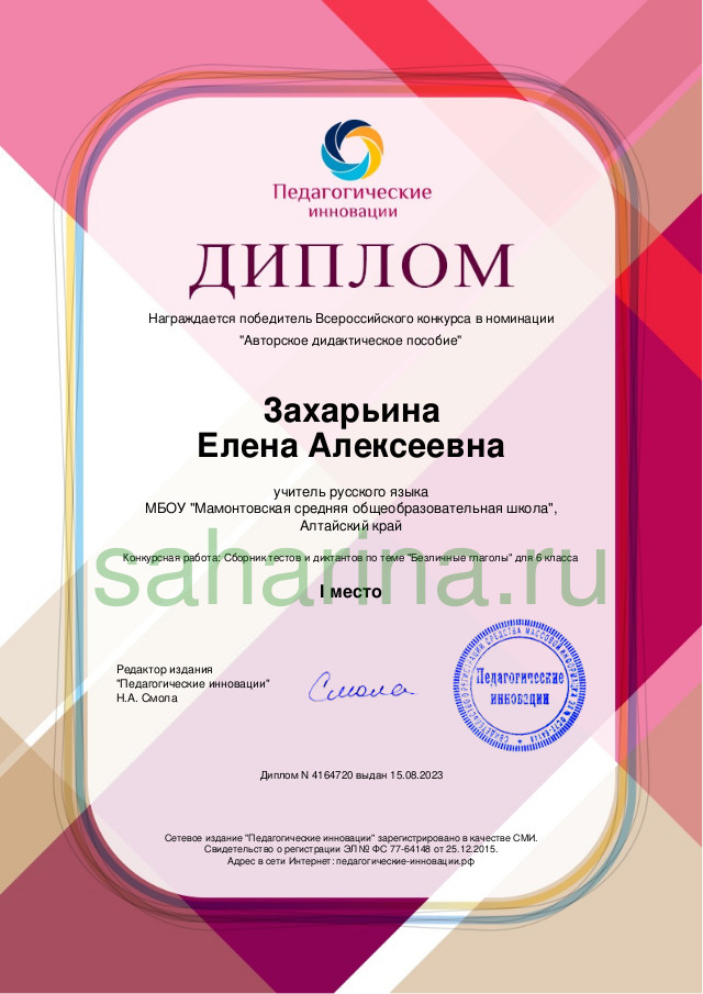 2023 годДиплом за 1 место во Всероссийском конкурсе «Педагогические инновации» в номинации «Авторское дидактическое пособие»